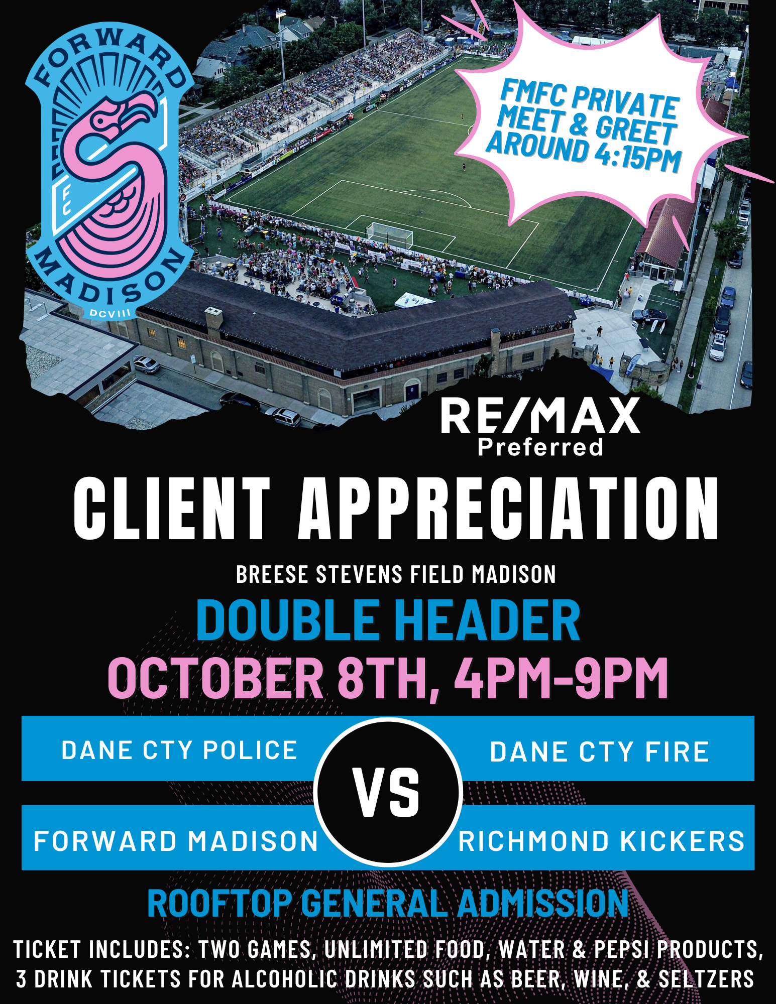 Rooftop General Admission section is completely private for the RE/MAX Preferred party through the Police vs Fireman charity match. During this time there will also be a Meet & Greet with the FMFC Players...including the opportunity for photos and autographs!!